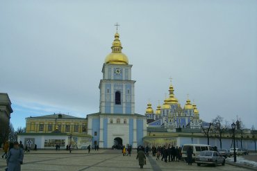 These next picture are from Kyiv (Kiev in Russian), in the center of Ukraine, and the capital. The picture at left is my Kyiv translator Tetyana Ilnystka (a rather brilliant and highly competent girl), who's clutching the male half of a recently erected monument to a famous Ukrainian film. Apparently, this is one of several spots in Kyiv to which a wedding party must travel in order to be photographed. Apparently, this involves a primitive fertility ritual in which the each member of the happy couple must rub the naughty bits of the statue of the opposite sex. The other picture is the newly rebuilt Mykhailivsky Zolotoverskhyi Monastery (that is, Michael's of the Golden Roof); apparently the Communists didn't like it and tore it down. It's real pretty. This, incidentally, is another stop on the obligatory wedding-party tour.